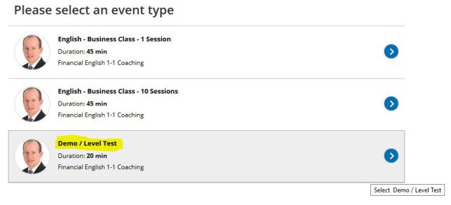 Firstly, I would like to make an individual appointment with you to give you a short demonstration of the virtual classroom. I will speak slow, easy English but you can ask any questions in German if you need to. During this appointment I will ask you some questions about yourself and your job in English so that I can hear what your level is. After that we can put you in group which is the right level for you and start the training.